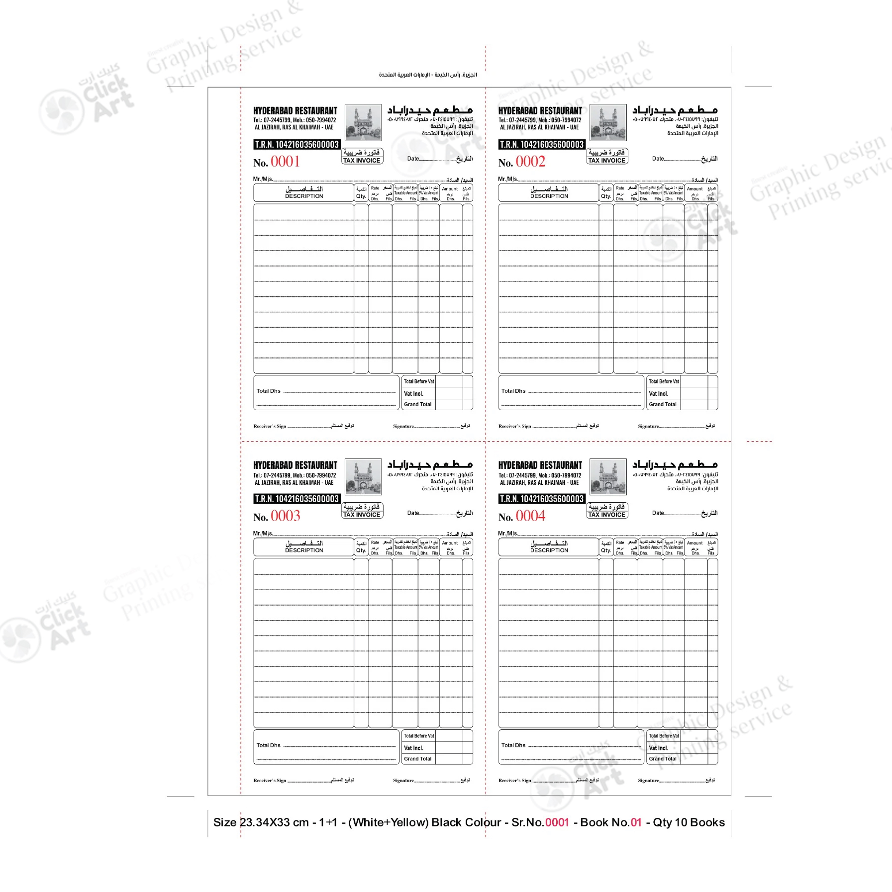 Ideal for restaurants, retail stores, supermarkets, delivery services, and offices in Oman, our 4-up bill books feature sequential serial numbering, book numbering, and perforated pages for smooth tear-off and accurate record keeping. Designed to meet VAT billing requirements in Oman, they are perfect for daily business use.