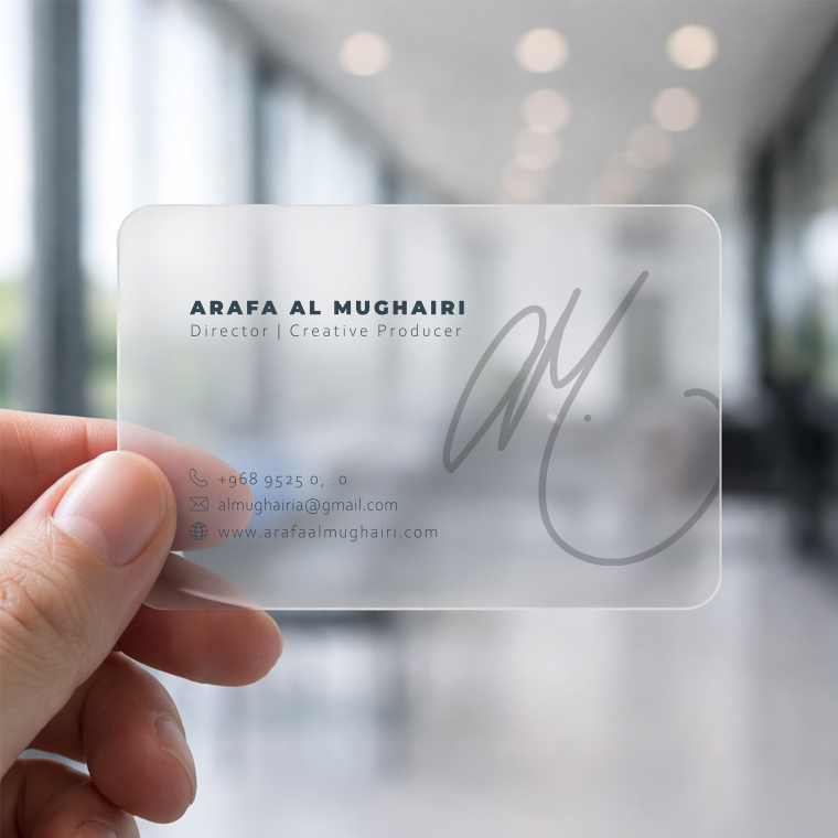 Transparent cards work best with clean, minimal designs. We recommend using a single logo and essential information for maximum impact.